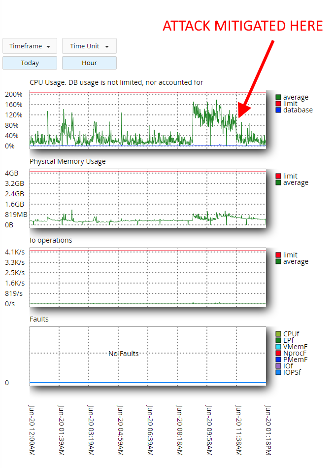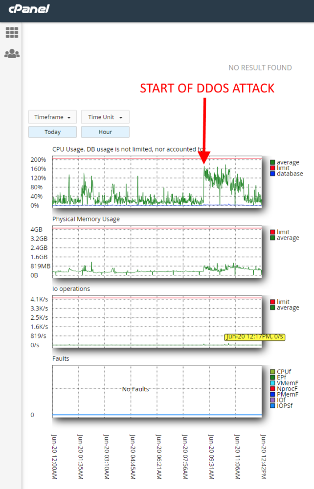 If you go into your web hosting control panel, there’s usually a place where you can see CPU usage. On GoDaddy Business Web Hosting, there’s a page on cPanel called “Resource usage”. If you click that, you’ll see your site’s CPU usage. Spikes in usage are a hint that you are under attack, especially if there is no other reason your site should be getting high traffic at the moment.