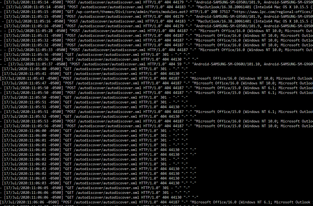 I had another case where Outlook and someone’s mobile phone were trying to hit the /autodiscover/autodiscover.xml file on the server: