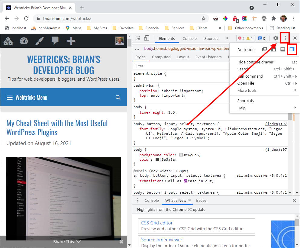 To move the DevTools window to the sidebar, click the 3-dot menu in the DevTools window, then select the “Dock to Right” icon as shown above.
