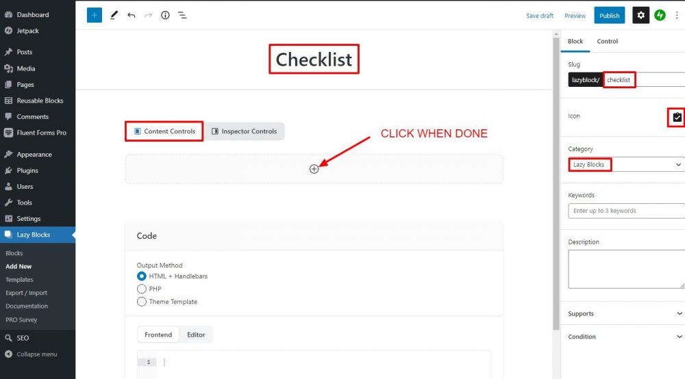 - Enter “Checklist” for the Block Name at the top of the editor.
