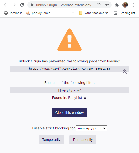 With these tweaks, I had my ads appearing with each of the four ad blockers that I tested on my Chrome browser. The only problem was that with uBlock Origin, most of my ad links were redirected to uBlock’s intermediate page, which looks like this: